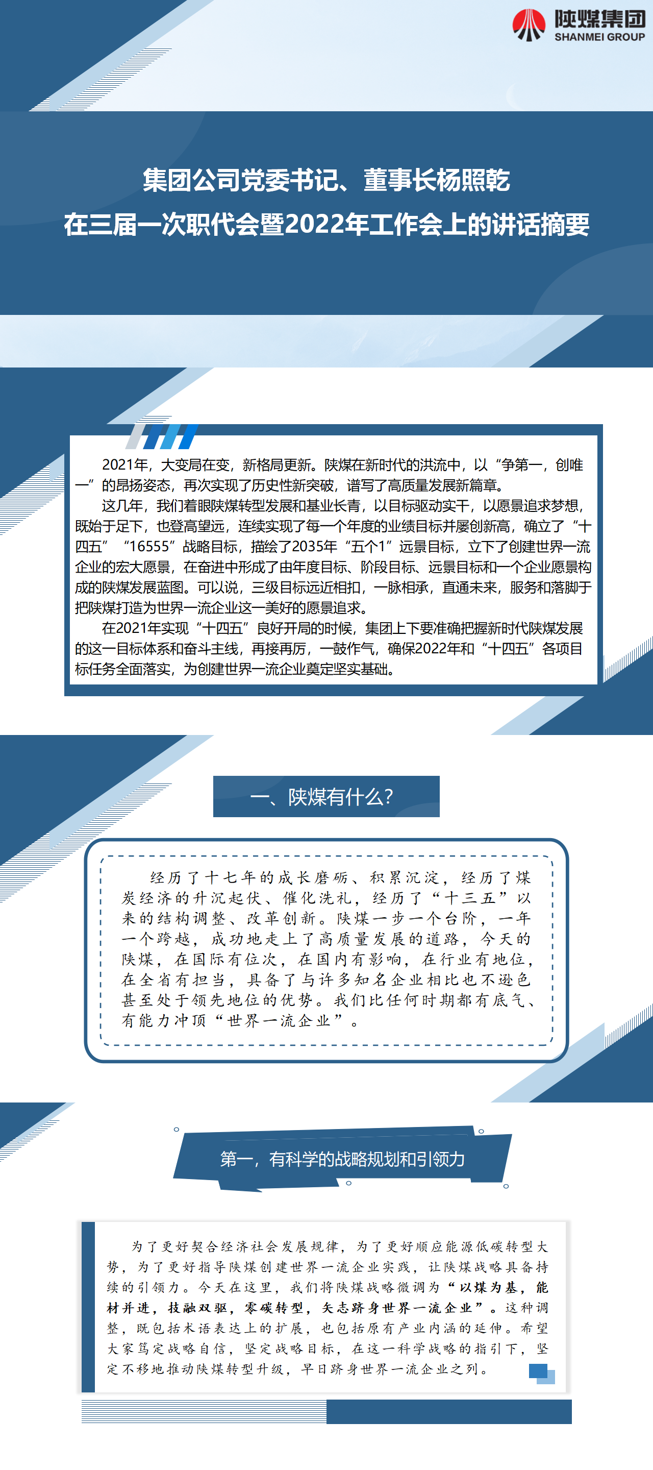 集團(tuán)公司黨委書記、董事長(zhǎng)楊照乾在三屆一次職代會(huì)暨2022年工作會(huì)上的講話摘要