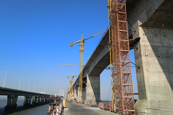 泉州灣海域風(fēng)大浪急,水域復(fù)雜,橋墩施工是此次建設(shè)中的難點(diǎn)。按照施工要求,在主墩的建設(shè)中,福建開(kāi)輝公司共投入4臺(tái)塔機(jī),頂升最終高度達(dá)168米。由于海面高空作業(yè),塔身晃動(dòng)非常大,為塔機(jī)標(biāo)準(zhǔn)節(jié)的加降帶來(lái)極大困難。現(xiàn)場(chǎng)技術(shù)人員針對(duì)這些特殊情況,采取防范措施,增加塔機(jī)與橋墩附著道數(shù),最密集的地方兩個(gè)標(biāo)準(zhǔn)節(jié)就要做一道附著,有效解決了超高塔機(jī)安全施工難題。安拆及維修人員憑借嫻熟精湛的技術(shù)和扎根于內(nèi)心深處的安全意識(shí),各方溝通協(xié)調(diào),各個(gè)環(huán)節(jié)緊密有序配合,最終圓滿完成了各類挑戰(zhàn)。