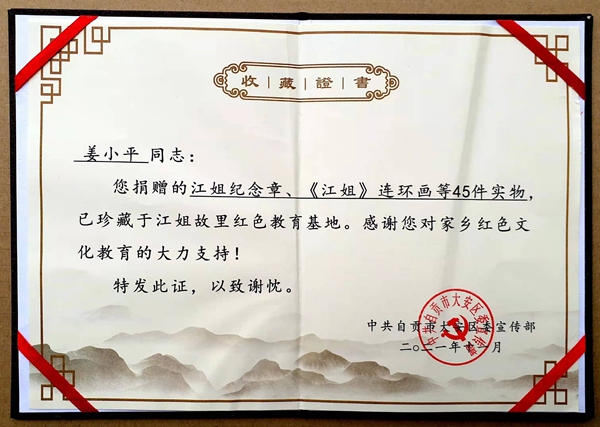 在“紅巖英烈”江姐犧牲72周年紀念日前夕,姜小平向自貢市江姐故里紅色教育基地無償捐贈了45件與江姐相關的文獻史料,讓藏品發揮應有價值,讓紅巖精神代代相傳。