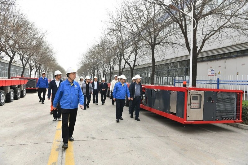 肖宇寧一行參觀了公司的裝配、電液、機加工、鉚焊、涂裝等生產(chǎn)車間,實地考察了192軸線模塊車的生產(chǎn)流程,并聽取了項目負責人關(guān)于產(chǎn)品設(shè)計、制造工藝、性能參數(shù)等方面的詳盡匯報。