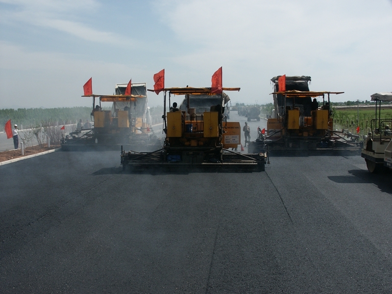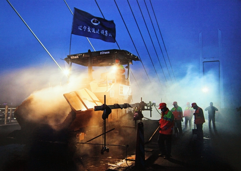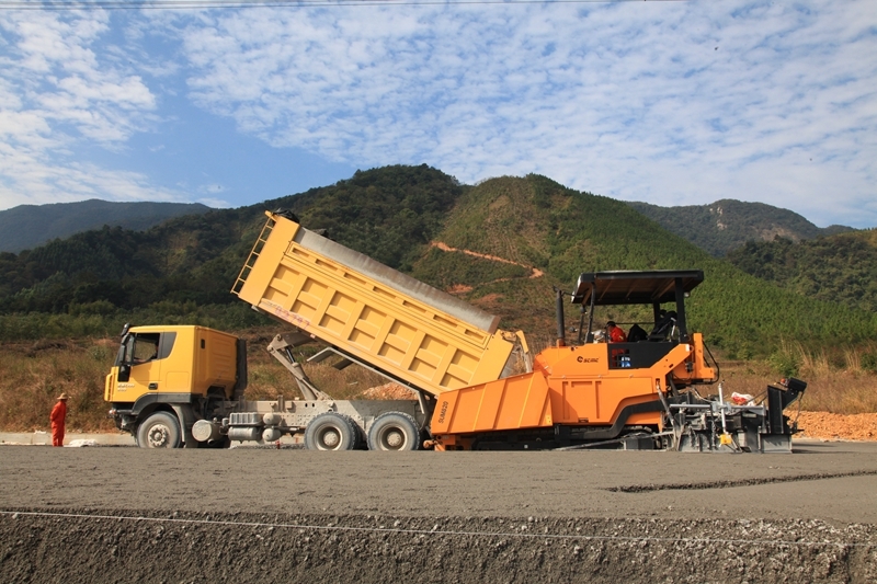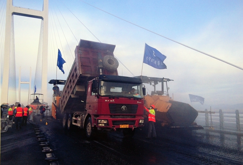 陜建機(jī)股份瀝青攤鋪機(jī)雙機(jī)并鋪助力中朝鴨綠江界河公路大橋建設(shè)2014年6月