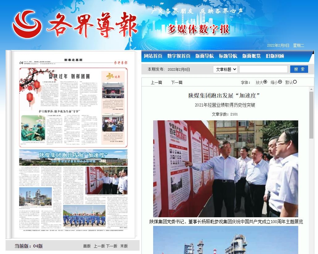 各界導(dǎo)報(bào) 2022年2月8日 4版陜煤集團(tuán)跑出發(fā)展“加速度”2021年經(jīng)營業(yè)績?nèi)〉脷v史性突破2021年,陜煤集團(tuán)以提高發(fā)展質(zhì)量為中心,以深化供給側(cè)結(jié)構(gòu)性改革為主線,以科技創(chuàng)新為根本動(dòng)力,迎難而上、攻堅(jiān)克難,在“十四五”開局之年實(shí)現(xiàn)新突破,經(jīng)營業(yè)績創(chuàng)歷史最好水平。資產(chǎn)規(guī)模超過6000億元,營業(yè)收入3952億元,利潤總額突破370億元;世界500強(qiáng)位次躍居第220位,在省內(nèi)創(chuàng)下了資產(chǎn)規(guī)模、營業(yè)收入、利潤總額、凈利潤、工業(yè)增加值、總產(chǎn)值六個(gè)全省第一,并以省屬企業(yè)五分之一的資產(chǎn),創(chuàng)造了四分之一的收入和二分之一多的利潤。這份成績的取得,來自于...