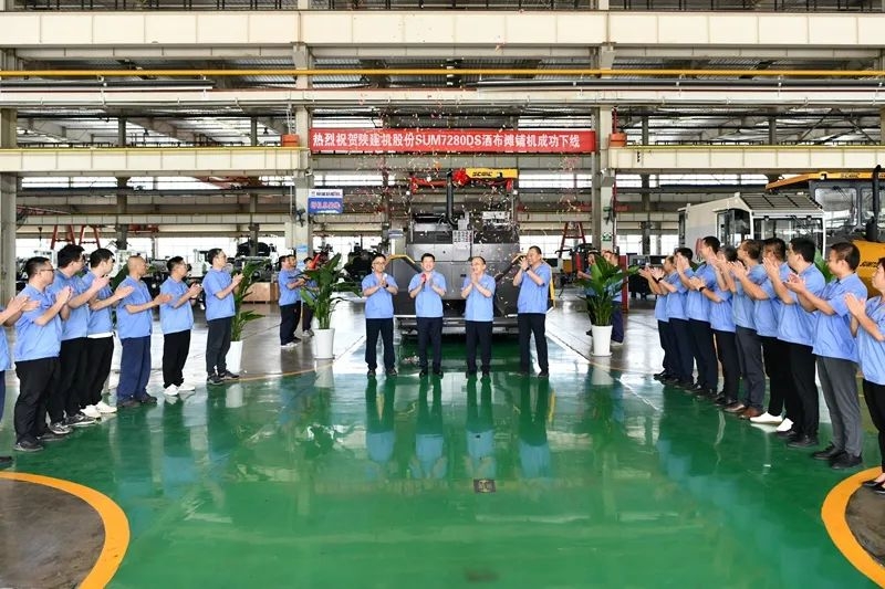 喜報(bào):陜建機(jī)股份首臺(tái)SUM7280DS灑布攤鋪機(jī)成功下線