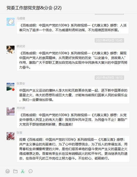 黨史學(xué)習(xí)教育開(kāi)展以來(lái),陜建機(jī)股份公司黨委認(rèn)真組織,積極引導(dǎo),有序開(kāi)展。在近日開(kāi)展的系列學(xué)習(xí)中,《百煉成鋼:中國(guó)共產(chǎn)黨的100年》系列微視頻分享,黨的光榮傳統(tǒng)和優(yōu)良作風(fēng)引發(fā)了黨員干部職工熱議。 陜建機(jī)股份公司黨委工作部黨支部黨員李丹珍在收看《百煉成鋼》系列微視頻二《老漁陽(yáng)里的秘密》后感慨談到:“這兩處看似尋常的石庫(kù)門(mén)建筑,卻與中共的誕生及初期活動(dòng)緊緊地維系在一起,“漁陽(yáng)里”因此成為中國(guó)共產(chǎn)黨孕育初心之地、紅色征程原點(diǎn)。昔日風(fēng)雨搖曳里的漁陽(yáng)里,今日化為不滅的民族精神。我們緬懷先烈...