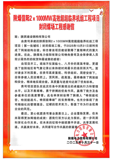 近日,陜西建設鋼構有限公司收到陜煤電力信陽有限公司發來的感謝信,信中對建設鋼構在承建陜煤信電2×1000MW高效超超臨界機組項目封閉煤場工程中表現的卓越的執行力和管理水平以及不畏艱難、勇于拼搏的優良作風表示誠摯的感謝!感謝信指出,陜煤信陽2×1000MW高效超超臨界機組工程項目封閉煤場工程于2025年10月31日順利完成了網架結構合攏,標志著該項目建設取得了里程碑式的重大進展。陜煤信電特向建設鋼構全體參建人員致以最熱烈的祝賀和最誠摯的感謝!感謝信中說,自項目開工以來,現場不僅面臨七、八月份的高溫考驗,更遭遇了信陽地區有...
